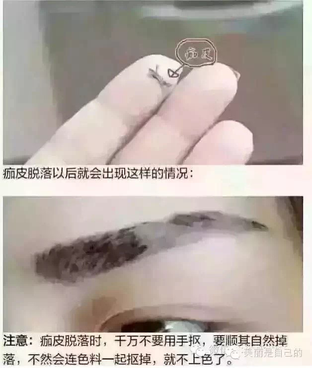 相信大家都会有小时候不小心蹭破的时候,都知道在结痂期间如果用手将痂皮强行扣剥下来,一般会导致发炎,或是感染,伤口比较难愈合的状况出现。那么做韩式定妆眉毛的结痂掉痂的原理也是一样的,所以在结痂和掉痂的时候,不要用手撕剥痂皮,让痂皮自行脱落。